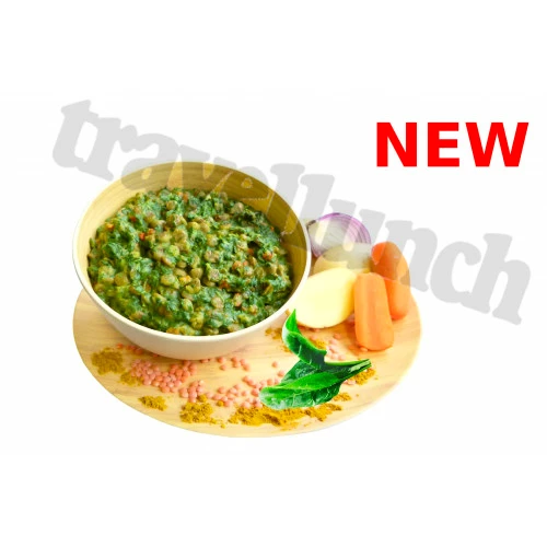 Food Travellunch Curry de lentilles aux épinards La combinaison inhabituelle de lentilles et d’épinards dans un curry vous surprendra par son goût délicieux. Profitez-en en déplacement, en camping ou sous une tente.
