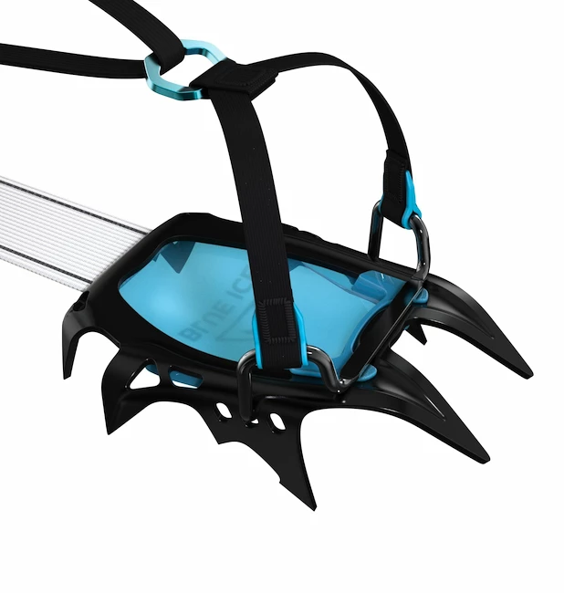Crampons Harfang Alpine classiques à 12 points de Blue Ice. Grâce aux accessoires, vous pouvez les utiliser comme chats automatiques ou semi-automatiques. On peut donc les enfiler sur des chaussures de ski-alpin, d’escalade et de randonnée. Il suffit de remplacer le trapèze métallique avant par un panier en plastique. La connexion des parties avant et talon est assurée par une sangle enduite HTPE très résistante au lieu d’une poutre métallique classique. Grâce à cela, les chats font bien leurs valises.