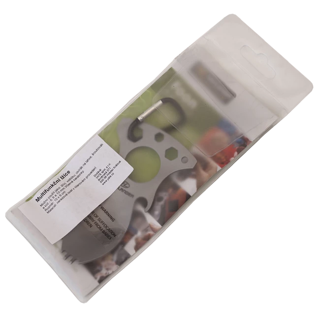 L’outil multifonctionnel Highlander Foon 5 in 1 contient une cuillère, une fourchette, un décapsuleur, un tournevis et une clé de 6, 8, 10 mm avec mousqueton.