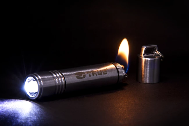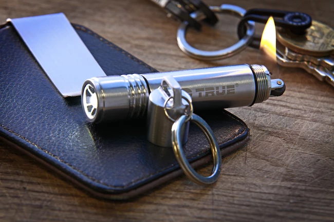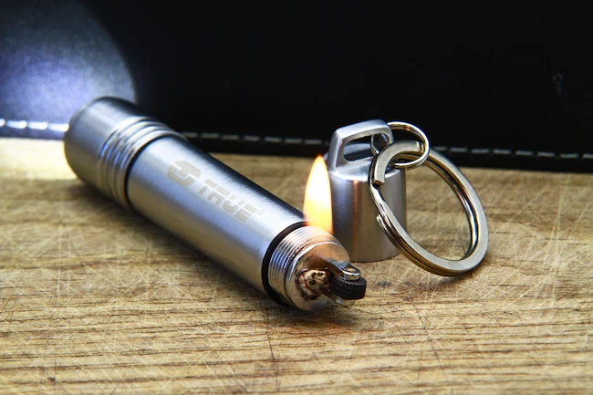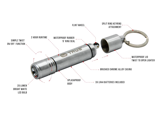 Le tube fin contient une LED puissante d’un côté, qui se recharge à l’aide de trois piles plates. De l’autre côté, vous trouverez un briquet à essence rechargeable. Grâce au bouchon à vis avec anneau, vous pouvez porter la lampe de poche sur vos clés et aucune situation ne vous prendra au dépourvu.