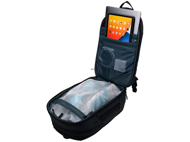 Le sac à dos de voyage dispose également de compartiments dédiés pour ranger les appareils électroniques et d’une poche pour une bouteille de boisson. Avec le sac à dos, vous pouvez utiliser le Thule Aion Sling (vendu séparément), qui allégera considérablement votre marche et, en plus, facilitera un accès rapide aux petits objets les plus importants. Les poches rembourrées permettent de ranger en toute sécurité un ordinateur portable 15,6″ ou un MacBook 16″, ainsi qu’une tablette 12,9″.